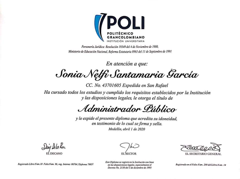 Hace días no teníamos noticias de la exconcejal sanrafaelita y expresidenta de Acora Sonia Nelfi Santamaria, esta semana nos contaron que esta líder se graduó en días recientes como administradora pública del instituto gran colombiamo, un peldaño más en su carrera política.